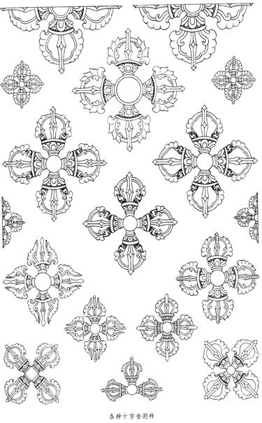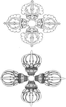 十字金刚杵是由四个带有莲花座的金刚杵组成,四个金刚杵的杵头从中心点向四大方位散射,象征着绝对的定力。在对须弥山进行宇宙学的描述中,巨大的十字金刚杵承托着物质宇宙或横在其下面。同样,在描述坛城时,巨大的十字金刚杵是坛城宫不可撼动的支撑物或地基。佛陀释迦牟尼得道的圣地菩提伽耶被称作“金刚座”[1],而佛陀不动的坐姿及大部分所绘坐神的纹丝不动的姿态被称作“金刚跏趺”[2]。在传统上,德高望重的佛教大师所坐的高高隆起的木制宝座前面都有一块方形锦缎,其中央处都有一个彩色十字金刚杵图,四角有四个小卐字符。这块锦缎代表不可撼动的大地或佛陀圆满的实现。在众多有形的观修中,特别是长时间的闭关静修中,十字金刚杵既可以画在或冥想成在修持者禅座的下面,同样,十字金刚杵标识也刻在金属板上,青铜佛像加持后须用它来封底。如果垂直十字金刚杵代表可视神灵的生成,那么,水平十字金刚杵则代表神灵之坛城宫所在的金刚地具有不可摧毁的稳定性。