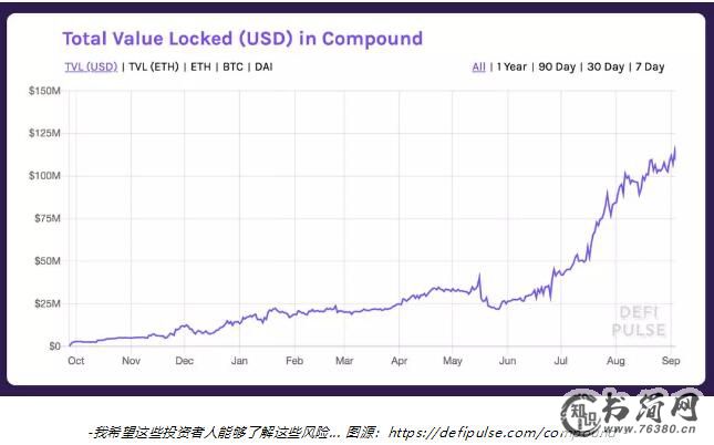 该合约保存的资产至少有六个月超过 2000万美元,至少有两个月超过 5000万美元,当前该合约里保存的资产超过 1亿美元。对我个人而言,合约安全最重要的指标是 合约持有总资产×合约保存资产时间,到目前为止,Compound 的安全性已经得到了大量公共资产的证明。