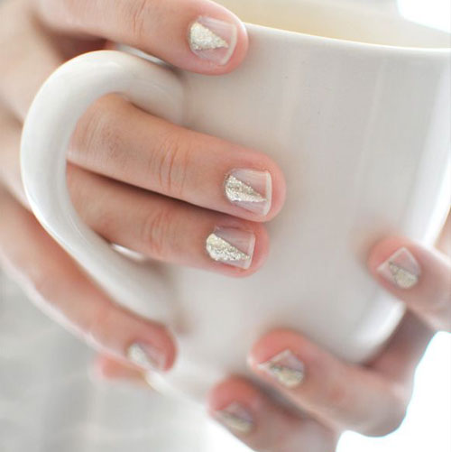 STEP4:在无名指的指甲尖,用银色闪粉指甲油涂抹。就按照平常指甲的形状涂抹就可以了,一层灰有点稀,最好涂抹两层,效果最好。