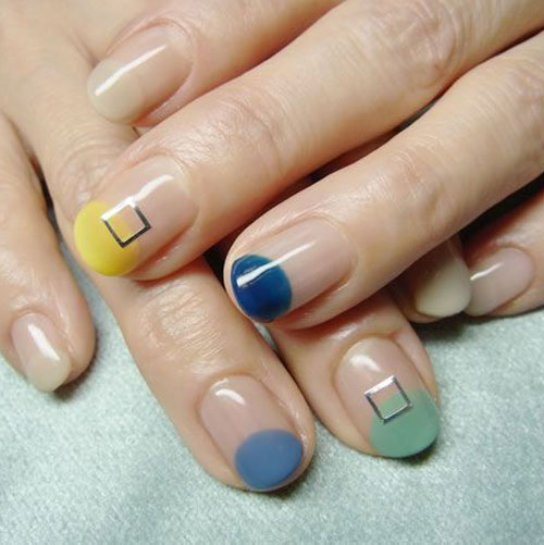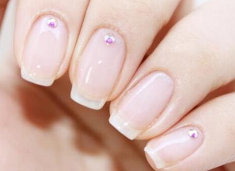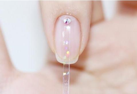 STEP1:先给所有的指甲都涂抹上一层透明的指甲油,等指甲完全干透之后,除了无名指,其它指甲底端中部都贴上圆形的闪钻,一定要固定好,要不容易脱落。