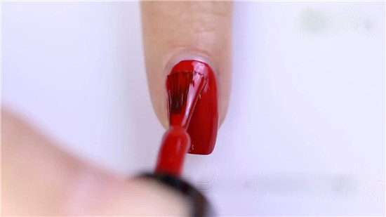 第一步:准备好所需的甲胶和工具,修剪指甲并打磨好甲面,刷上底胶,照灯60秒。为甲面均匀的涂上红色底色,照灯60秒。