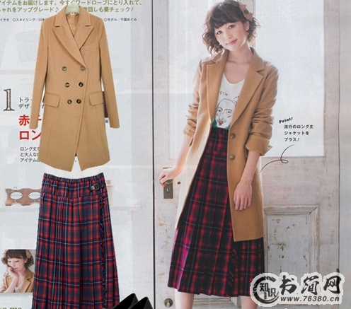 杏色毛呢修身外套搭配英格兰格子毛呢长裙很有复古范,上装长大衣,下装长裙,两两碰撞,更显修长,今季这样的搭配绝对绝对时尚还能让人过目不忘。
