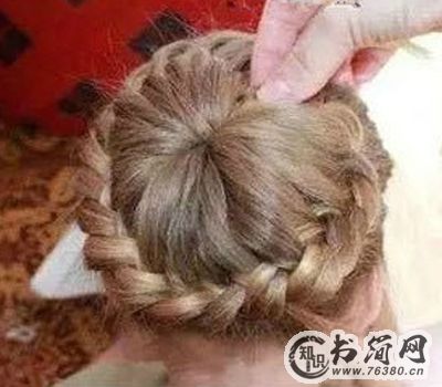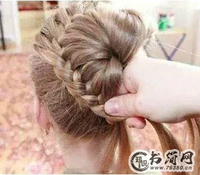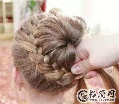 5、当前额的头发全部编织完成,就围绕马尾将其剩余的头发全部编完。