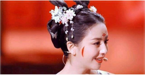 斜红,又名晓霞妆,是古代一种特殊的面饰。梳妆时,在女子眼角两旁各画一条竖起的红色弯弯新月形,美艳无比。斜红是唐妆的典型代表,是盛唐女子的妆容之一。