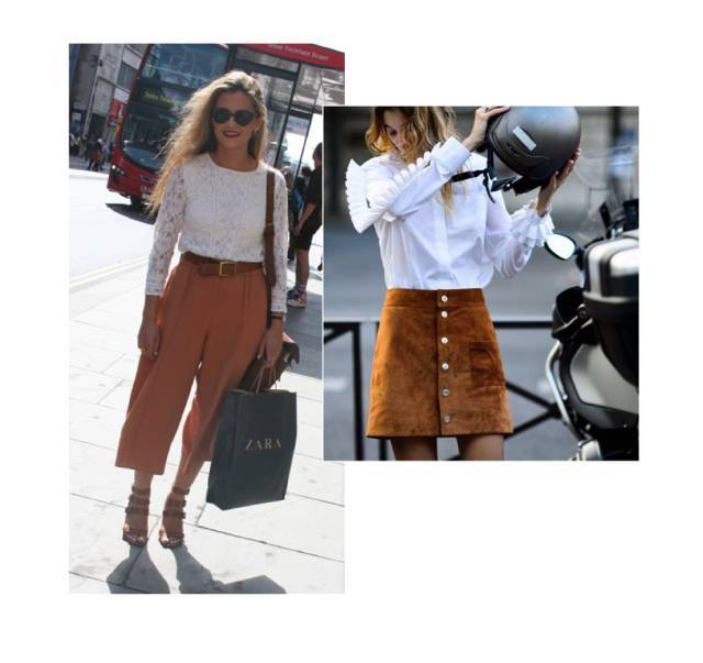 用焦糖色搭配有女性化细节(蕾丝、花边等)的白色上衣,娇俏可爱的少女感就能GET!