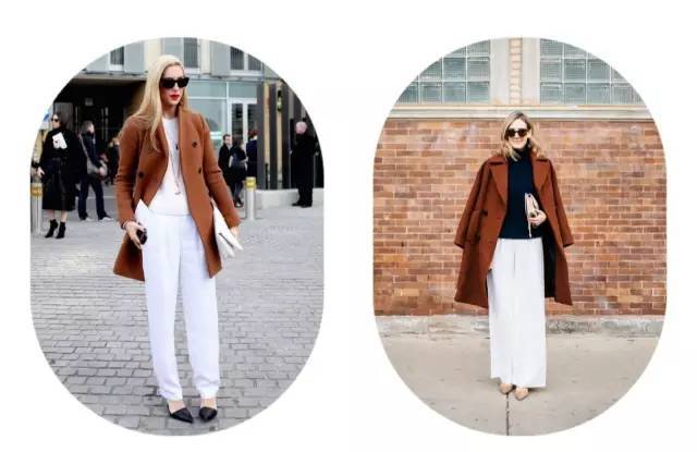 走优雅路线的姑娘可以在黑白+焦糖的基础上,配以尖头高跟鞋和阔腿裤,强大的气场就能打造出来。