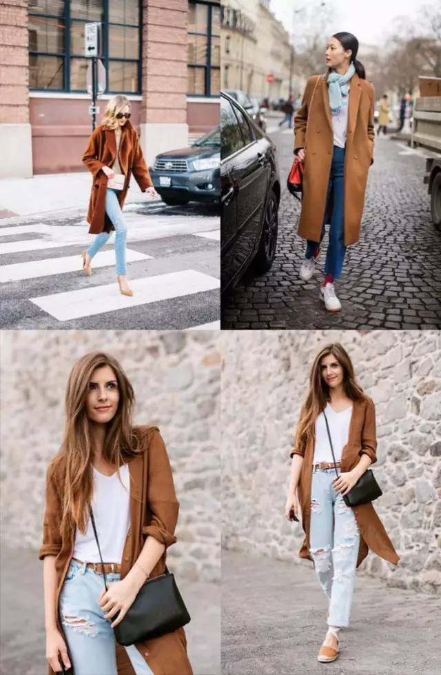 觉得大面积的焦糖色太浓厚,担心自己驾驭不了?那可以尝试焦糖色的上衣,搭配浅蓝色牛仔裤,中和掉一部分厚重感,让整体造型变得活力清爽。
