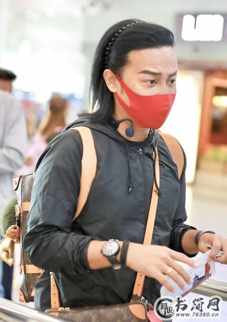 这次陈志朋头戴发卡,用红色口罩遮面,大冷天不惧寒穿短裤露腿,背双肩包加斜挎包造型别致。