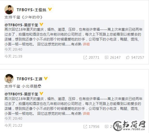 易烊千玺的微博发布后,两位好兄弟王源和王俊凯都转发了,王源写道:“支持千玺,小北很酷!”,王俊凯写道:“支持千玺《少年的你》!”