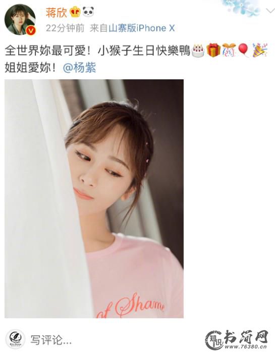蒋欣晒出一张杨紫可爱照片,配文称:“全世界你最可爱,小猴子生日快乐,姐姐爱你”。